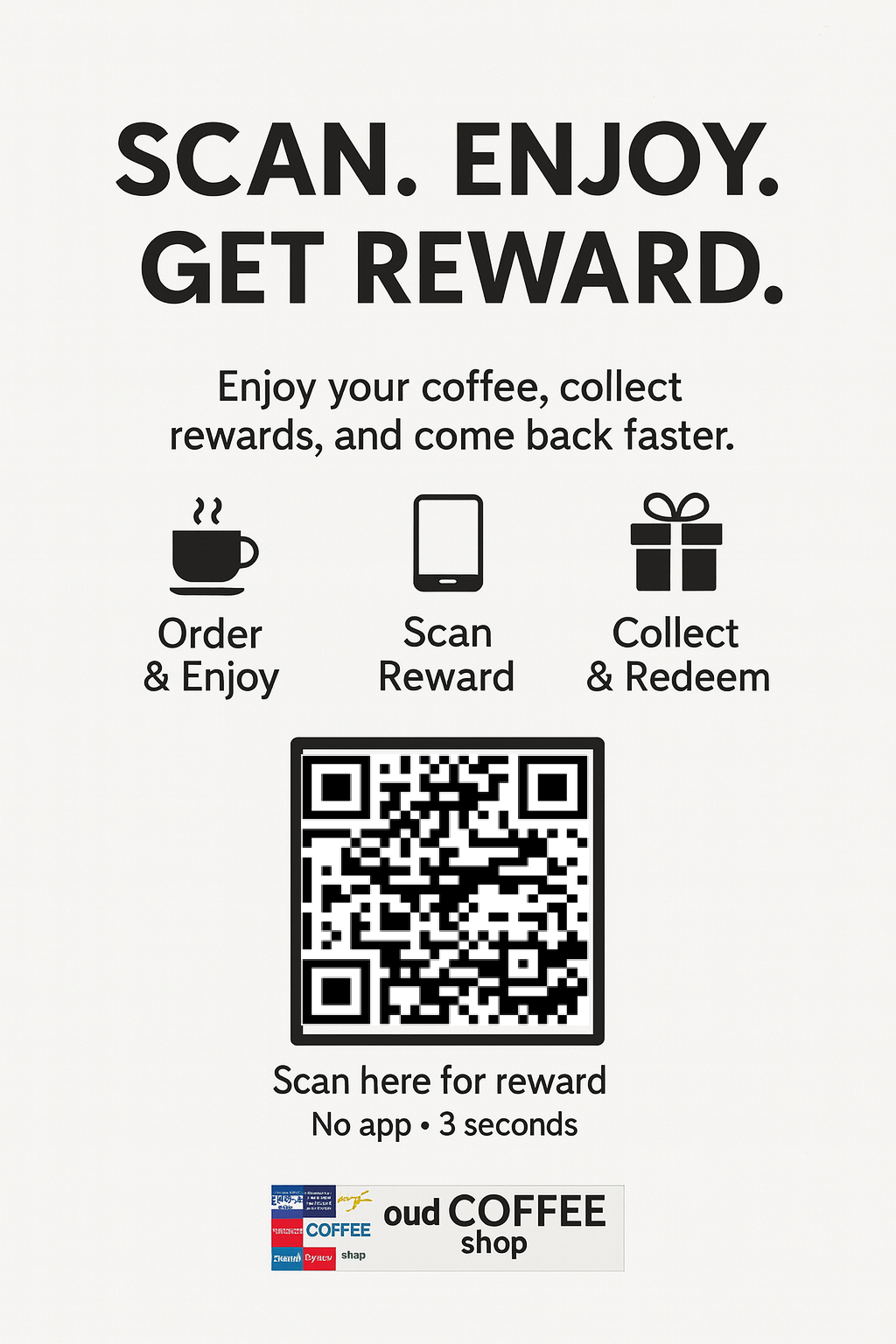 카운터/테이블/입구에 부착하면 손님 행동(방문/후기/재방문)이 연결됩니다.